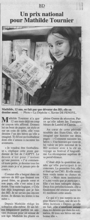 Je profite de l'espace disponible pour présenter quelques dessins de ma petite soeur Mathilde. Son talent lui a valu un prix national à Angoulème ainsi qu'un article dans La Dépêche (08/02/2000).